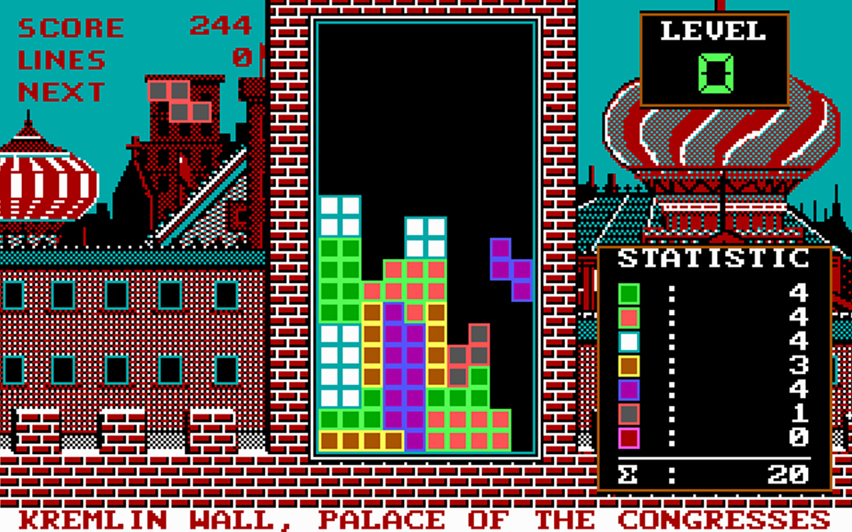 La première version de Tetris n’a pas de graphismes, pas de son, pas de couleur. Les blocs sont représentés par des crochets [ ] de texte vert sur fond noir. Pourtant, la magie opère instantanément. Alexey ne peut pas s’arrêter de jouer. Ses collègues non plus. Le jeu se propage comme un virus informatique sur les disquettes 5 pouces ¼ à travers tout Moscou, puis dans tout le bloc de l’Est.