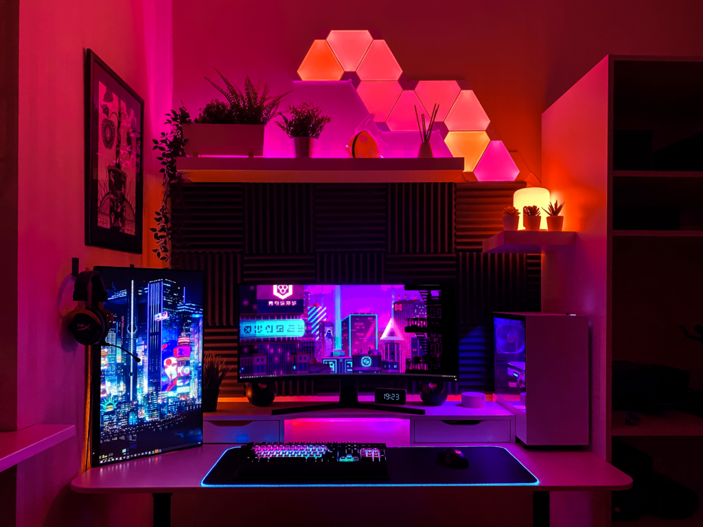 - Panneaux LED géométriques : Des marques comme Nanoleaf ou Govee tapissent les murs de triangles ou d’hexagones diffusant des dégradés de rose et de violet.
